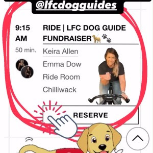 Join me, Emily Hammersmark (dog guide recipient) at Mambacycle Chilliwack on September 21, 2025 at 9:15 am. Where we will ride to the beat of the music, and raise funds for the future of the Lions Foundation of Canada Dog Guides.